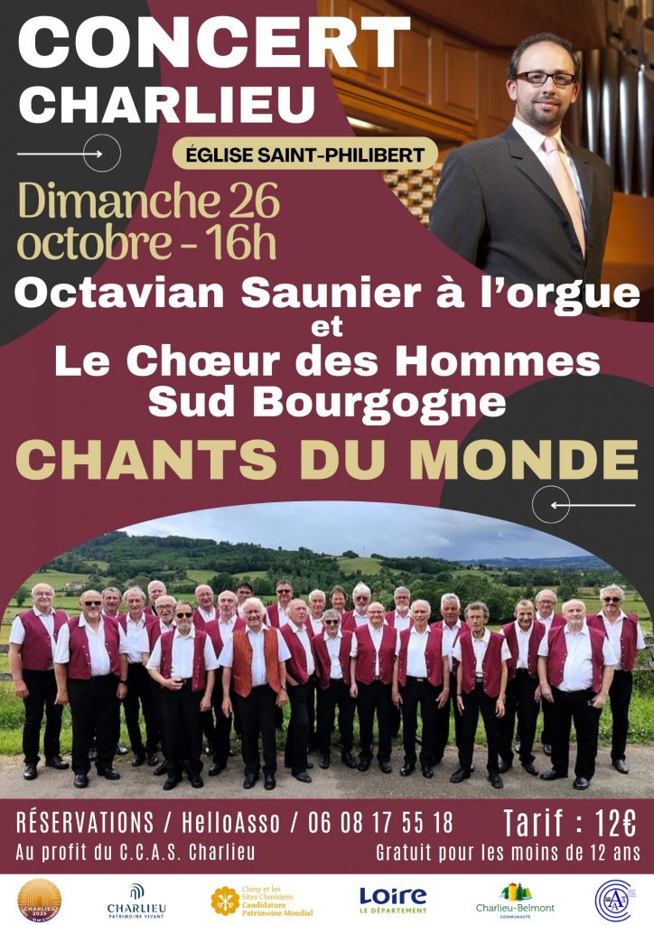 Ce concert proposé par l’association des amis de l’orgue et du carillon de Charlieu (AAOCC) au profit du CCAS vous offrira un moment musical unique. Musique sacrée et chants du monde seront au rendez-vous grâce aux talents du Chœur des Hommes Sud Bourgogne accompagné à l’orgue par Octavian Saunier, organiste de renom.