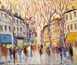 Rien d’abstrait dans son œuvre, au contraire. On y trouve les couleurs bigarrées d’un marché, le sourire ou la nostalgie des filles au bar des cafés, l’ensoleillement d’un jour d’été, la lumière insaisissable de la neige ou encore les pêcheurs à pied d’une plage sous la pluie… La fête, la tristesse ou même la détresse… Tout est vivant, animé, grouillant. C’est la sensibilité exacerbée du peintre pour les scènes quotidiennes qui s’exprime dans ses toiles, celle qui a vocation à nous faire « ressentir le beau par le sensible, l’émotion, la sensation ».